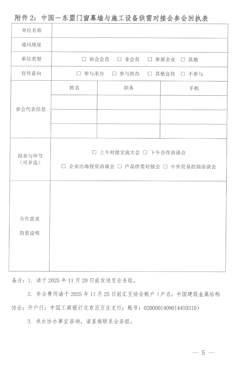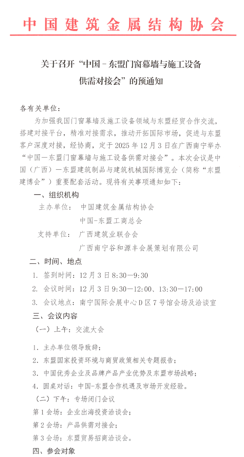为加强我国门窗幕墙及施工设备领域与东盟经贸合作交流,搭建对接平台,精准对接需求,推动开拓国际市场,促进与东盟客户深度对接,经协商,定于2025年12月3日在广西南宁举办“中国一东盟门窗幕墙与施工设备供需对接会”。本次会议是中国(广西)-东盟建筑制品与建筑机械国际博览会(简称“东盟建博会”)重要配套活动。现将有关事项通知如下: