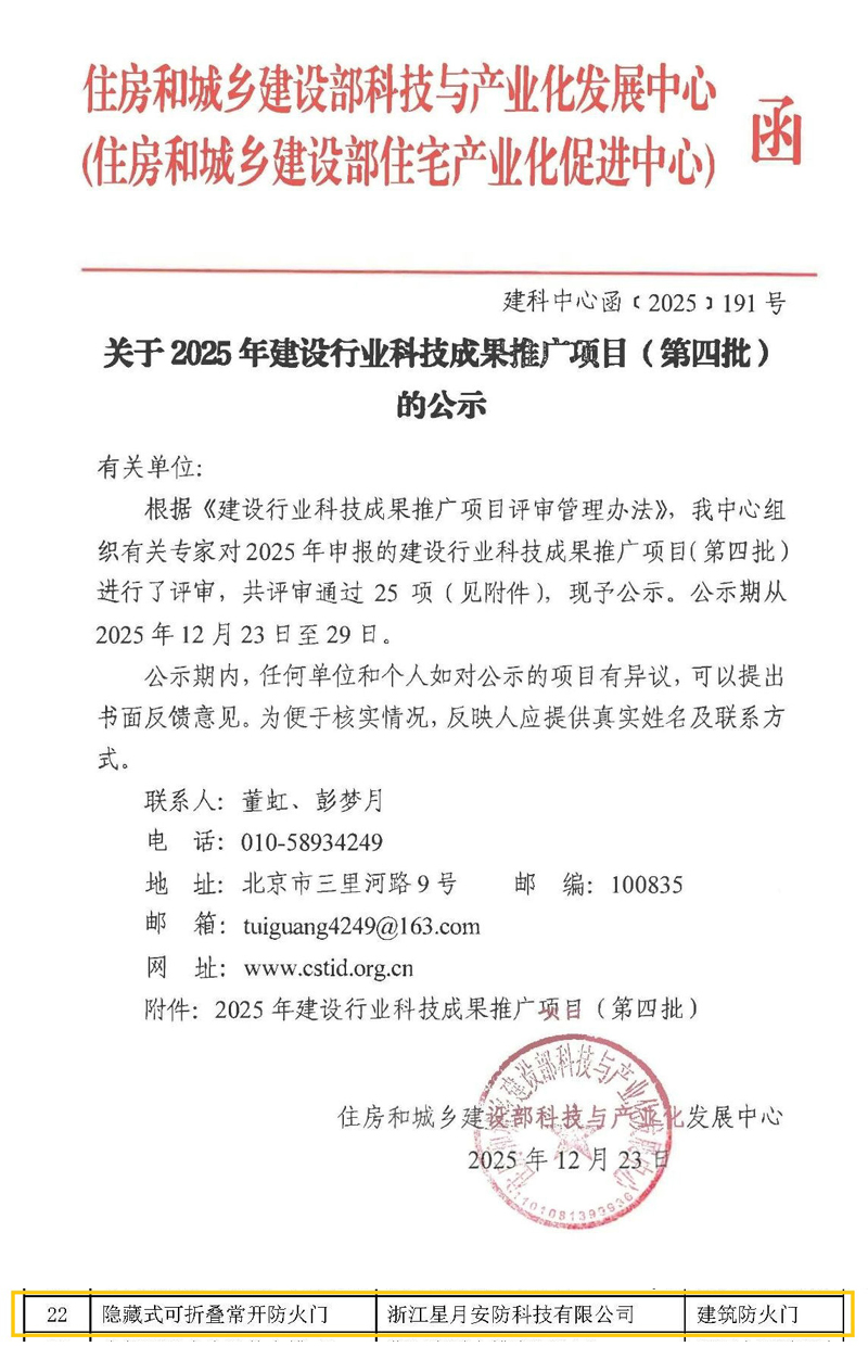 2025年12月23日,住房和城乡建设部科技与产业化发展中心发布的《关于2025年建设行业科技成果推广项目(第四批)的公示》显示,“隐藏式可折叠常开防火门”科技成果位列第22栏,归属建筑防火门类目。