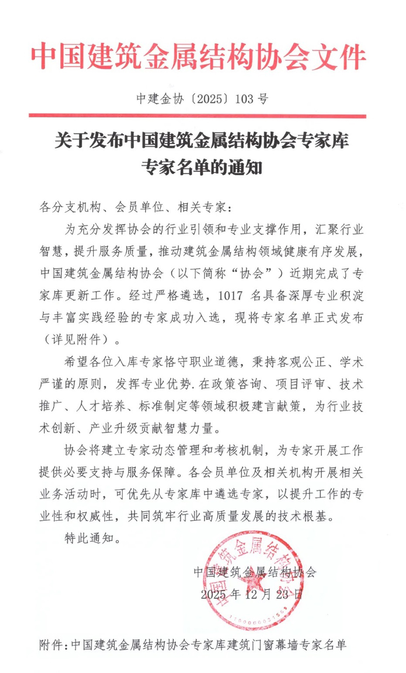 12月23日,中国建筑金属结构协会发布《关于发布中国建筑金属结构协会专家库专家名单的通知》,经遴选,1017名具备深厚专业积淀与丰富实践经验的专家成功入选,专家名单正式发布(详见附件)。其中建筑门窗领域共260名。