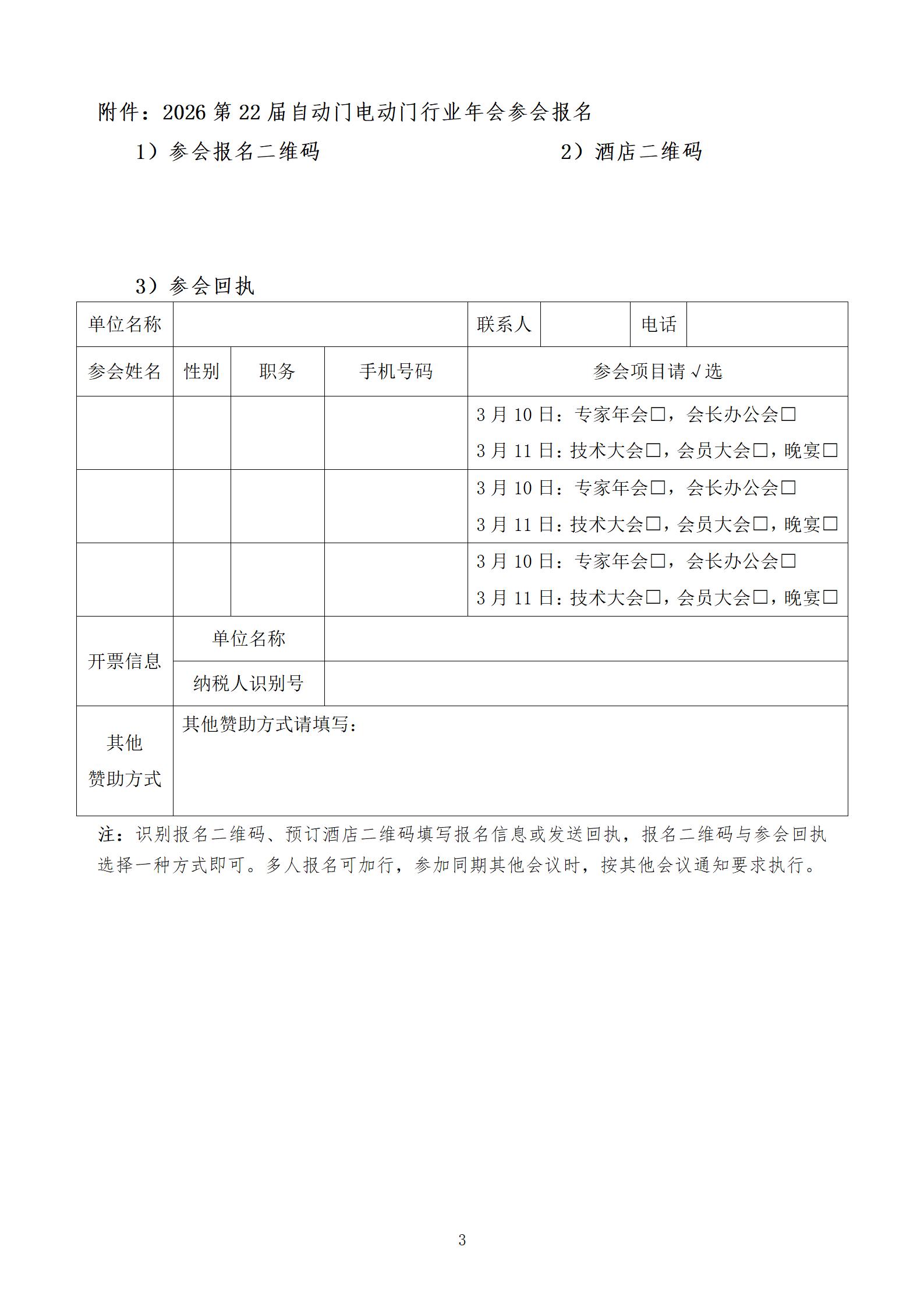 为贯彻落实中央经济工作会议精神,帮助会员了解国家产业政策、国内外经济形势和市场前景,以科技创新引领行业新质生产力和高质量发展,构建行业新一届组织架构,经我会研究,定于2026年3月11日,即“中国(北京)国际自动门电动门暨高性能门窗展览会”开幕前一天,召开以“守正创新、聚力融合”为主题的第22届自动门电动门行业年会。现将相关事项通知如下: