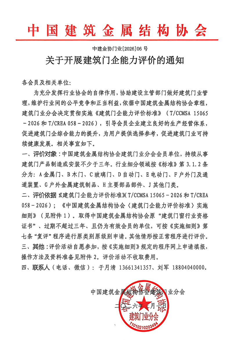 为充分发挥行业协会的自律作用,协助建设主管部门做好建筑门业管理,维护行业间的公平竞争和正当利益,依据中国建筑金属结构协会章程建筑门业分会决定贯彻实施《建筑门企能力评价标准》(T/CCMSA15065-2026和T/CREA058-2026),引导会员企业建立良好的生产经营体系,促进建筑门企综合能力的提升,为用户提供选择参考,促进建筑门业可持续健康发展。相关事宜如下。
