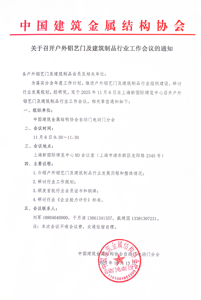 为落实分会年度工作计划,推进户外铝艺门及建筑制品行业组织建设,研讨行业发展规划,经研究,定于2025年11月6日在上海新国际博览中心召开户外铝艺门及建筑制品行业工作会议。相关事宜通知如下: 一、组织单位: 中国建筑金属结构协会自动门电动门分会 二、会议时间: 11月6日9:30~11:30 三、会议地点: 上海新国际博览中心M3会议室(上海市浦东新区龙阳路2345号) 四、主要议程: 1.介绍户外铝艺门及建筑制品行业发展历程和整体情况; 2.研讨行业工作规划; 3.颁发首批行业会员证书和铜牌; 4.研讨行业《企业能力评价》标准。