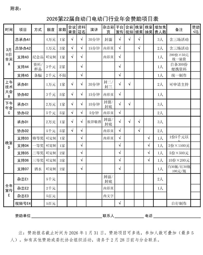 为贯彻落实中央经济工作会议精神,帮助会员了解国家产业政策、国内外经济形势和市场前景,以科技创新引领行业新质生产力和高质量发展,建立健全分会组织架构,经研究,拟定于2026年3月11日,即"北京国际家居产业博览会中国(北京)国际智能门电动门及高性能门窗展览会"开幕前一天,召开第22届自动门电动门行业年会。