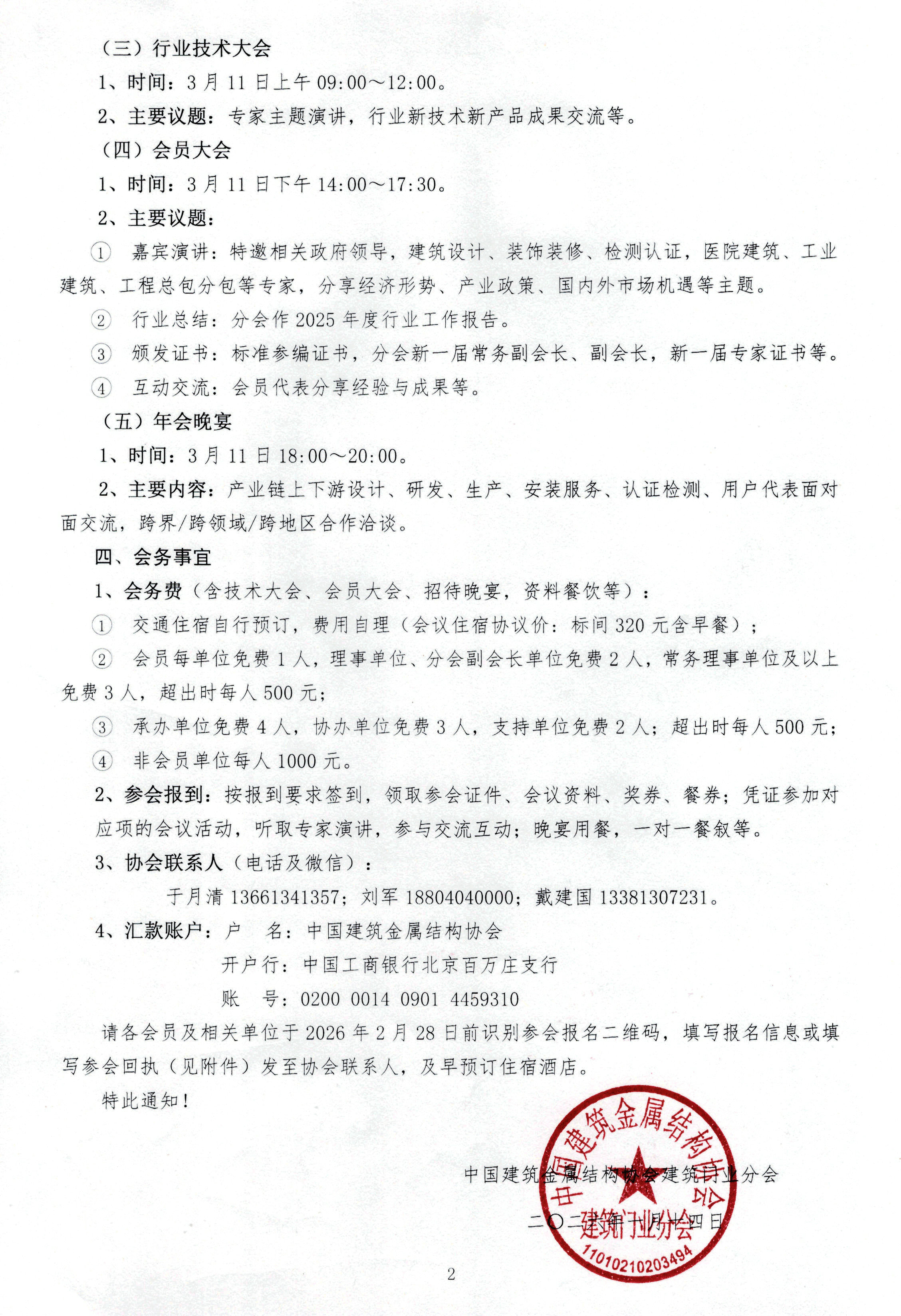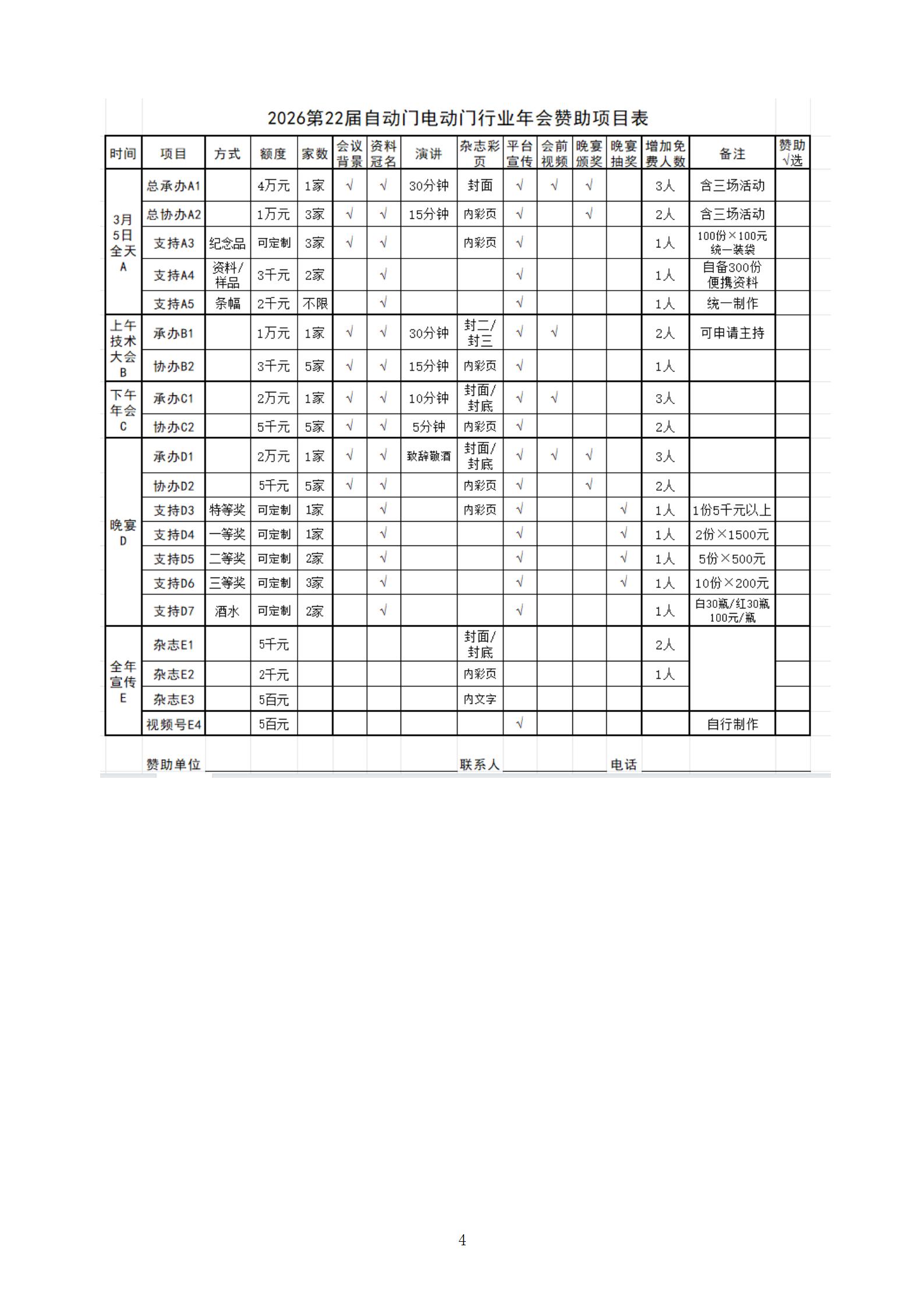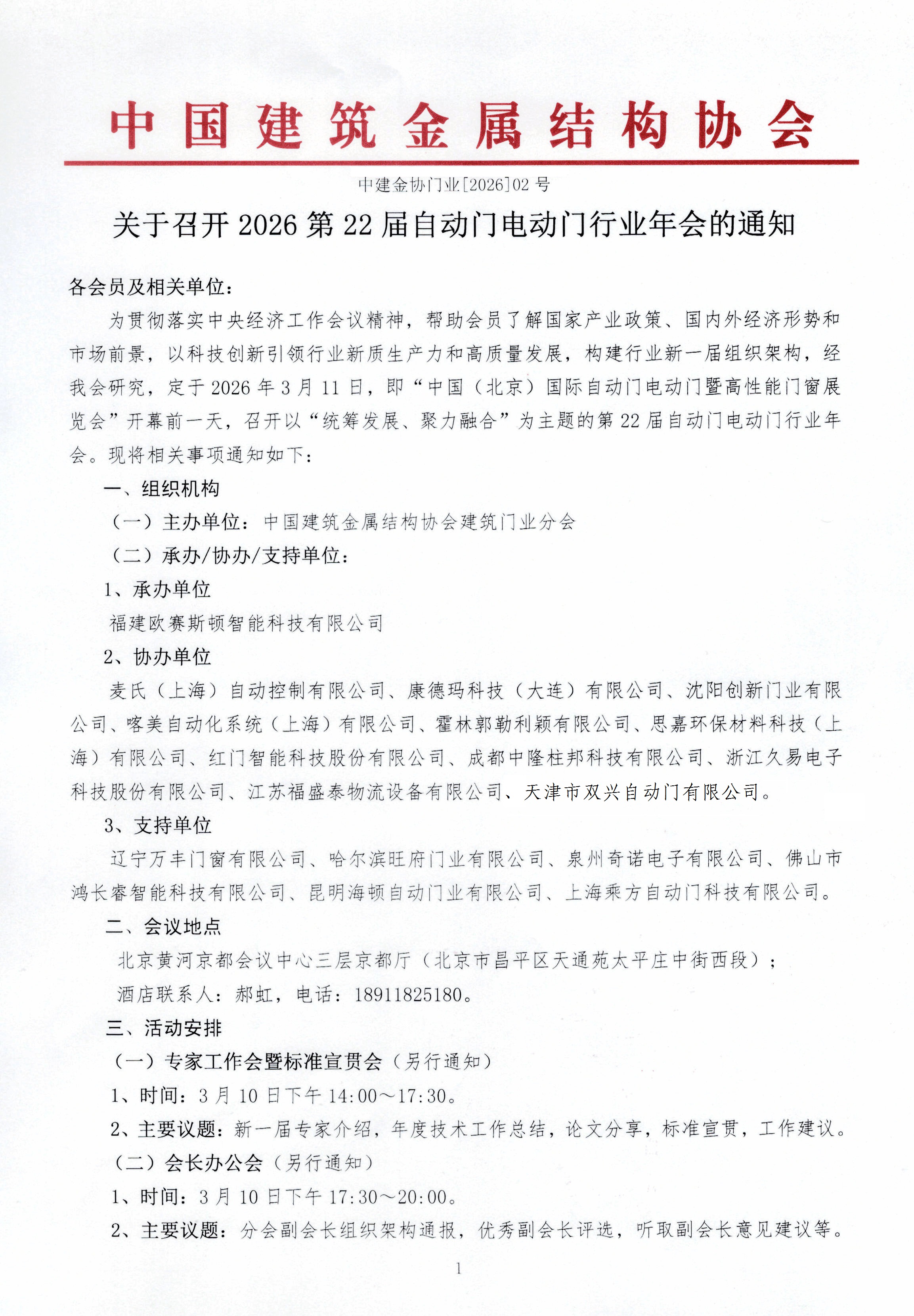为贯彻落实中央经济工作会议精神,帮助会员了解国家产业政策、国内外经济形势和市场前景,以科技创新引领行业新质生产力和高质量发展,构建行业新一届组织架构,经我会研究,定于2026年3月11日,即“中国(北京)国际自动门电动门暨高性能门窗展览会”开幕前一天,召开以“守正创新、聚力融合”为主题的第22届自动门电动门行业年会。现将相关事项通知如下: